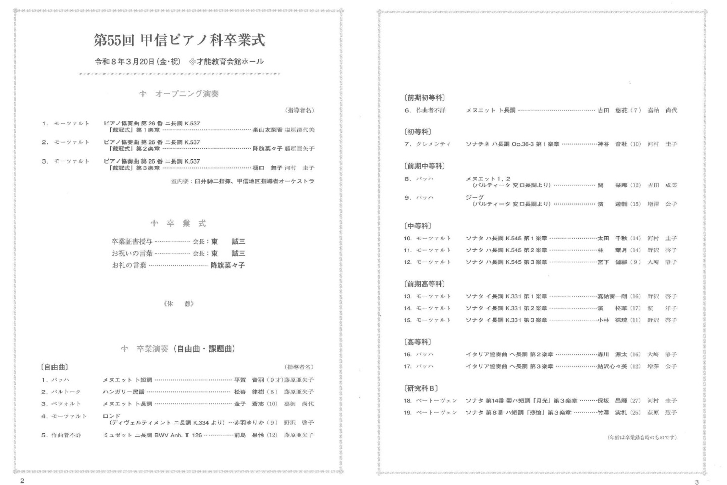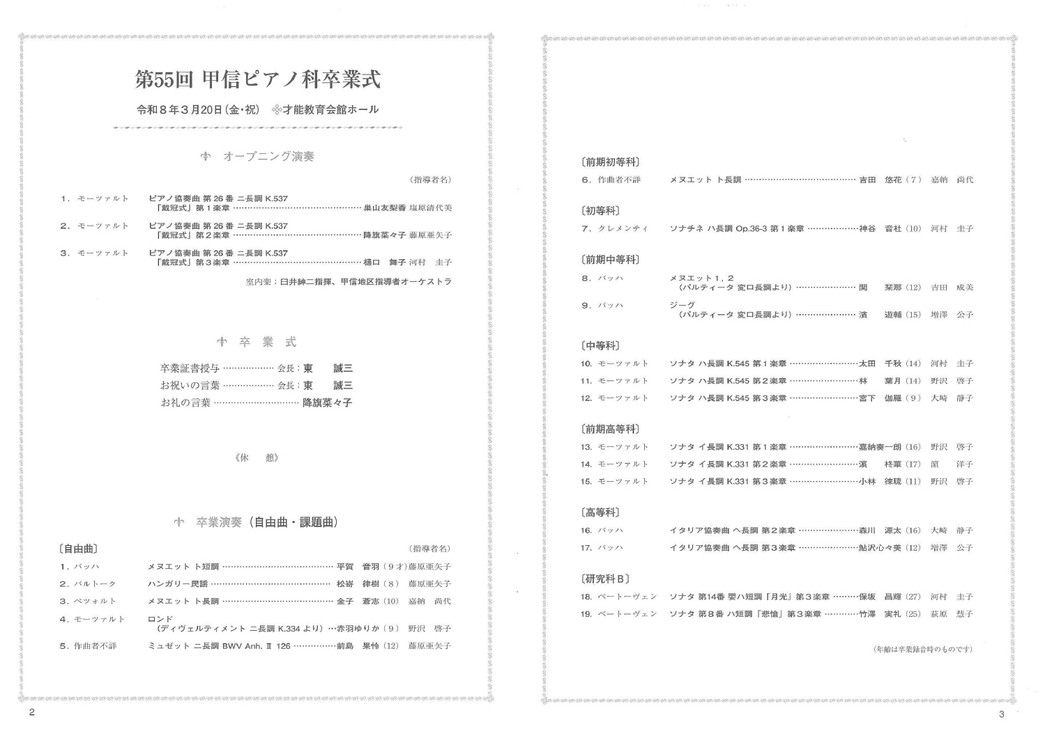 この素晴らしい日に、甲信地区ピアノ科では東誠三会長、臼井文代先生、黒河内健業務執行理事をお迎えして「ピアノ科卒業式」を行なうことができました。