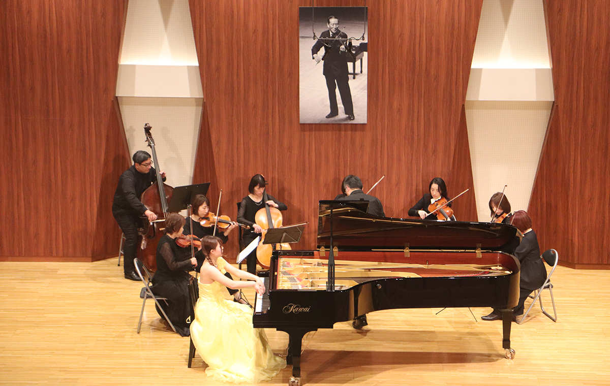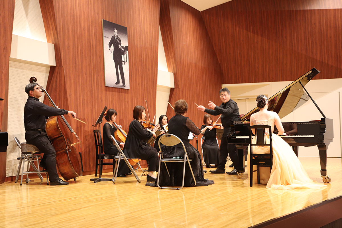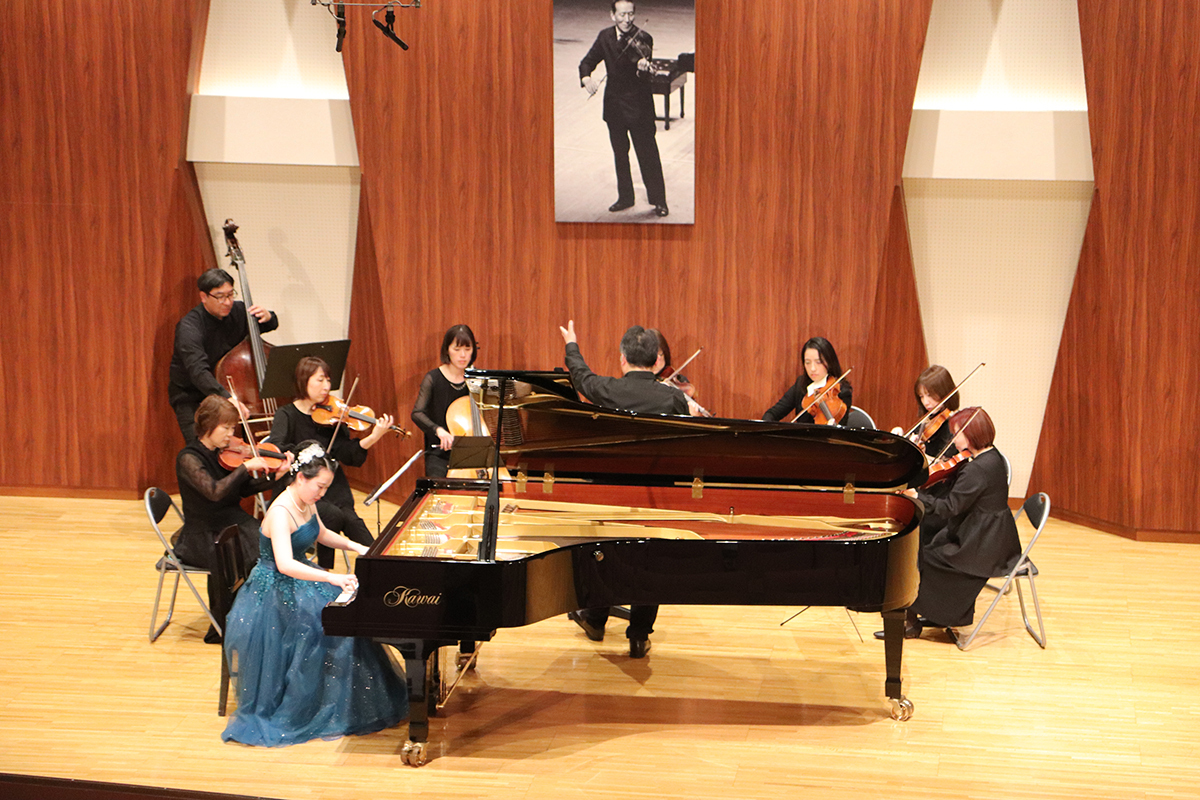 はじめに、オープニング演奏として、生徒3名が1楽章ずつモーツァルトのピアノ協奏曲「戴冠式」を臼井紳二先生指揮、甲信地区指導者オーケストラのご協力をいただき、演奏しました。東先生も式典のご挨拶の中で仰っていらっしゃいましたが、甲信地区の弦楽の先生方には、11月から準備、練習、リハーサルと大変お世話になりました。感謝申し上げます。