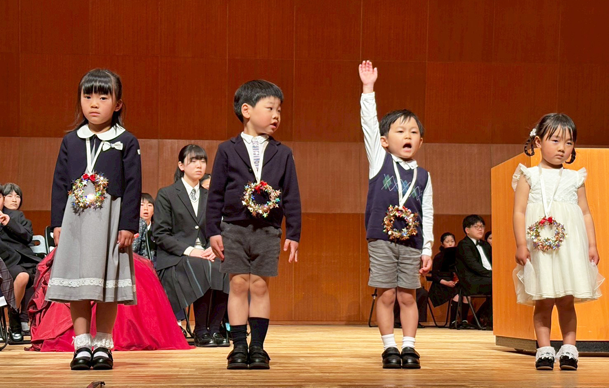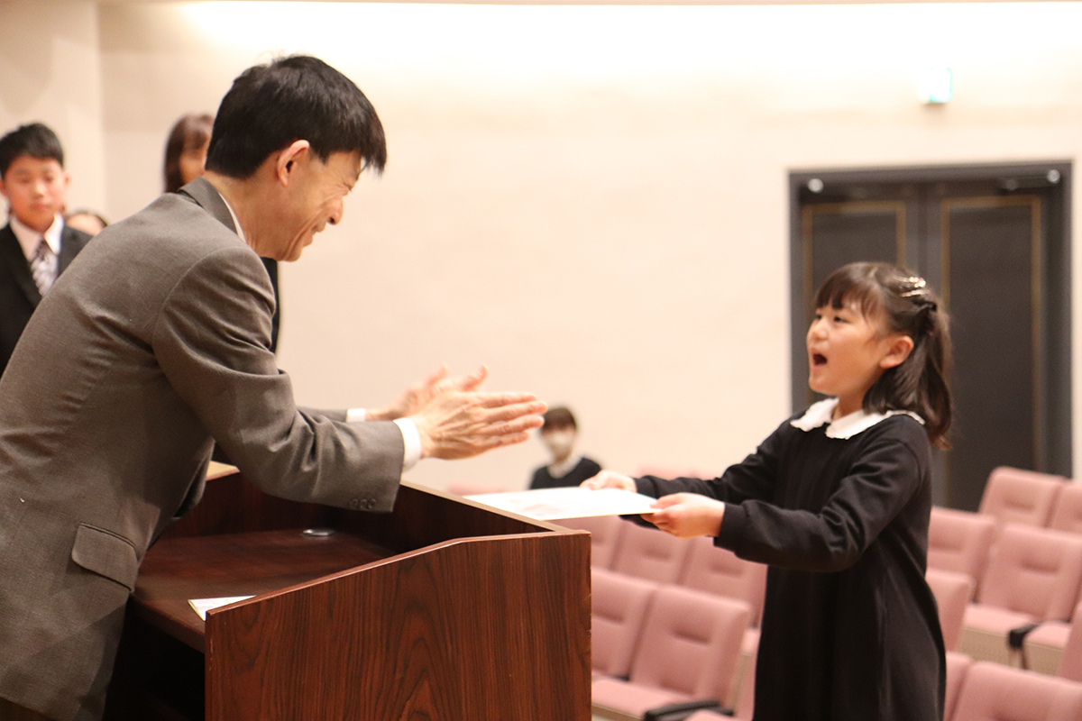 手作りしていただいたメダルが生徒たちの胸にキラキラと輝いています。お名前を呼ばれて、元気なお返事、小さなお返事、落ち着いたお返事と、それぞれの個性が輝きました。