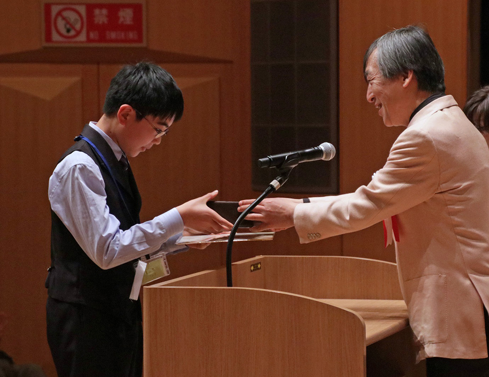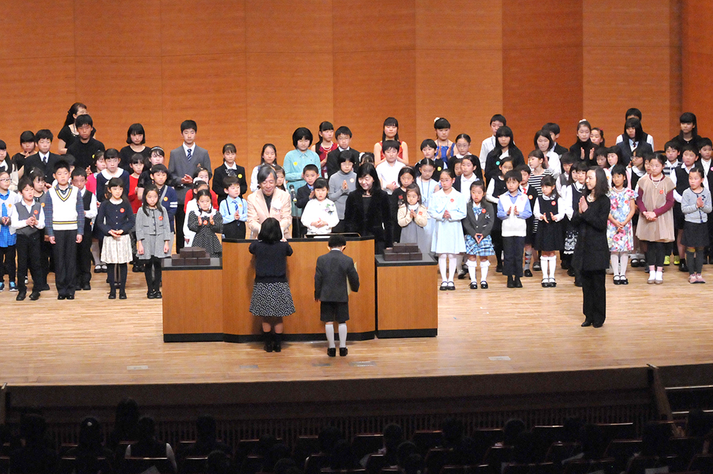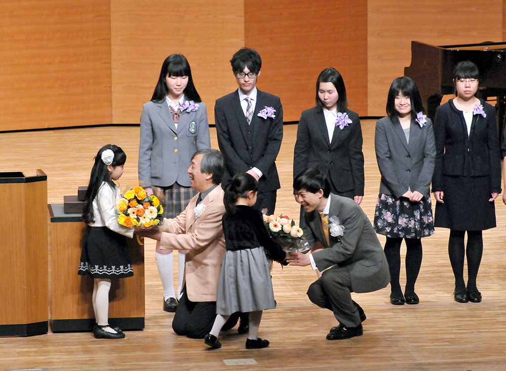 式典では、前期初等科から研究科Aまでの卒業生が4つのグループでステージに上がり、会場の皆さんから祝福していただきました。そして、各科代表生徒へ早野龍五会長より卒業証書が授与されました。最終課程研究科Bを卒業した生徒へは、早野会長とピアノ科教授、東誠三先生より記念品を一人ひとりに授与していただきました。