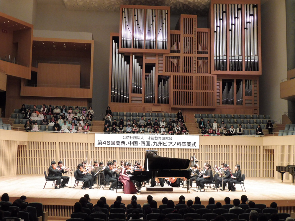 ピアノ協奏曲K.488の素敵な響きが、卒業式の雰囲気を盛りたてました 第46回関西、中国・四国、九州地区ピアノ科卒業式は、今年も京都コンサートホール大ホールで開催されました。最初は、スズキ・メソード関西地区オーケストラによる祝賀演奏、ディヴェルティメントK.138第1楽章です。モーツァルトの清らかな音で卒業式らしい雰囲気になったところで、ピアノ協奏曲K.488の演奏。