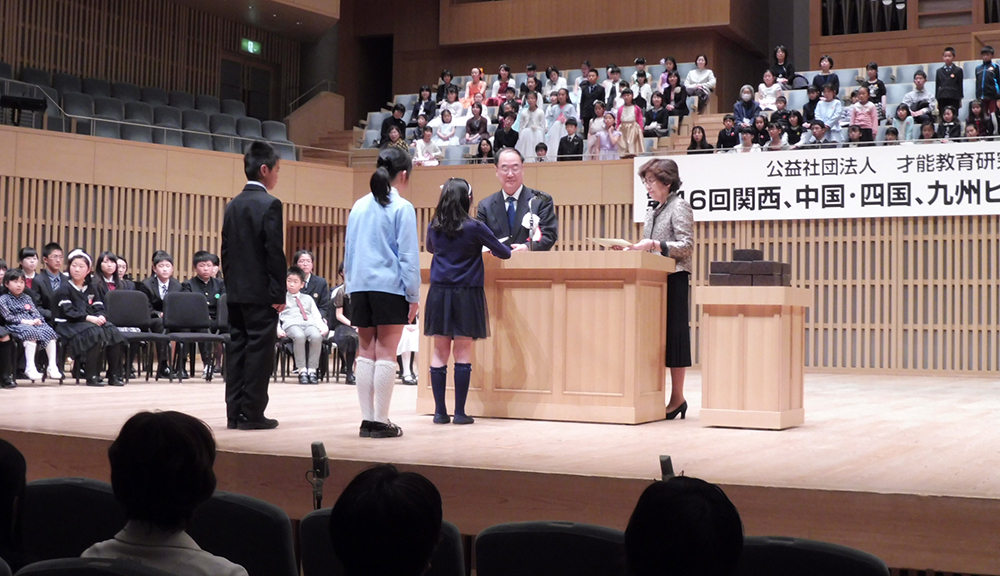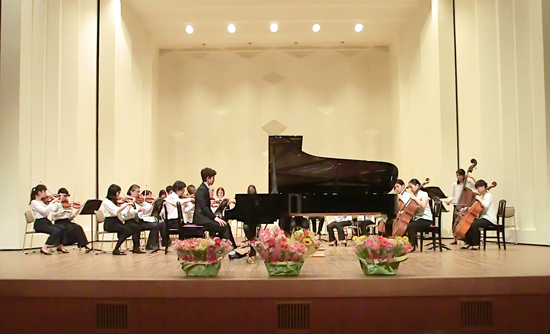 オープニングは、関東地区ヴァイオリン科指導者の印田礼二指揮 スズキ・メソード関東地区オーケストラの皆さんによる祝賀演奏です。そして、才能教育課程卒業科の卒業曲、モーツァルトのピアノ協奏曲K.537「戴冠式」全楽章の演奏で幕を開けました。会場はオーケストラの素晴らしい演奏、