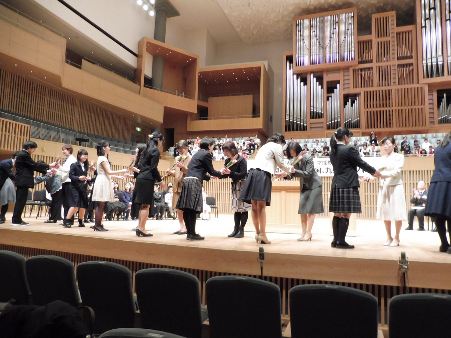 才能教育課程の卒業生は、卒業課程の一区切りとして、保護者の方にもステージに上がっていただき、生徒一人ひとりが感謝を込めて、お花のプレゼントをしました。