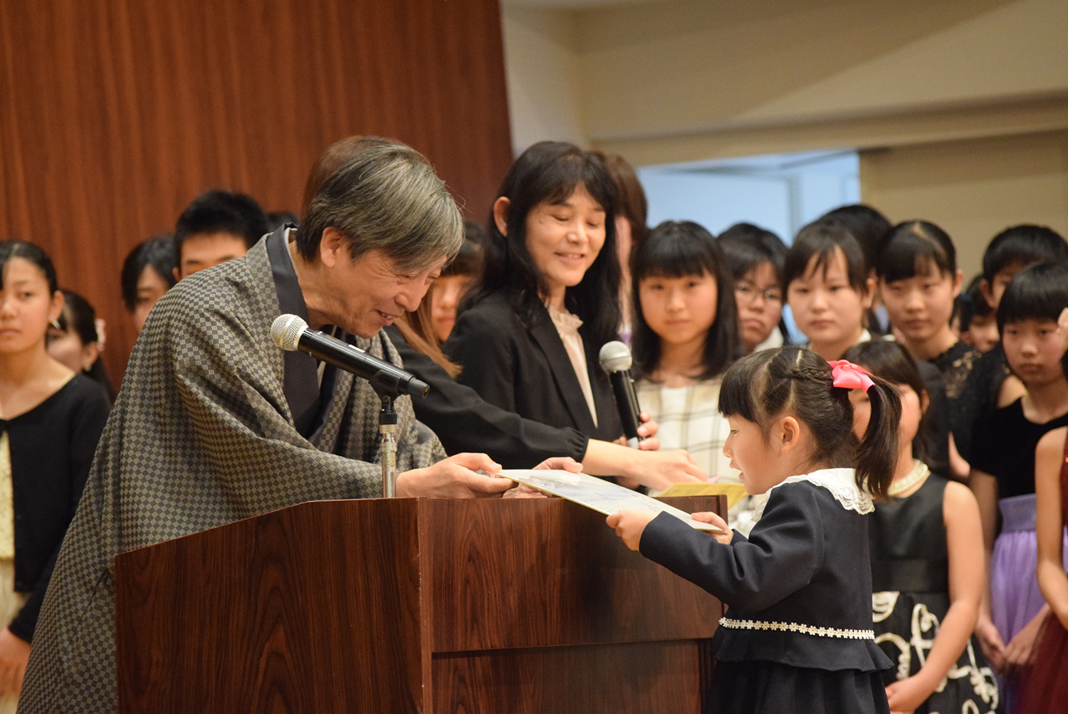 臼井紳二先生指揮による、甲信地区指導者オーケストラと生徒たちのモーツァルトのピアノ協奏曲 第26番 ニ長調「戴冠式」K.537の演奏で幕が上がり、会場は一気に華やかな雰囲気に包まれました。卒業式式典では、早野会長が、参加した卒業生全員に一人ひとり卒業証書を手渡ししてくださり、卒業生も緊張した面持ちで受け取っていました。早野会長から「今日、ここに集まっておられる卒業生の皆さんは、来年には、一つ上の科の卒業生になって、また参加するのですよ、いいですね?」と激励の言葉をかけていただきました。