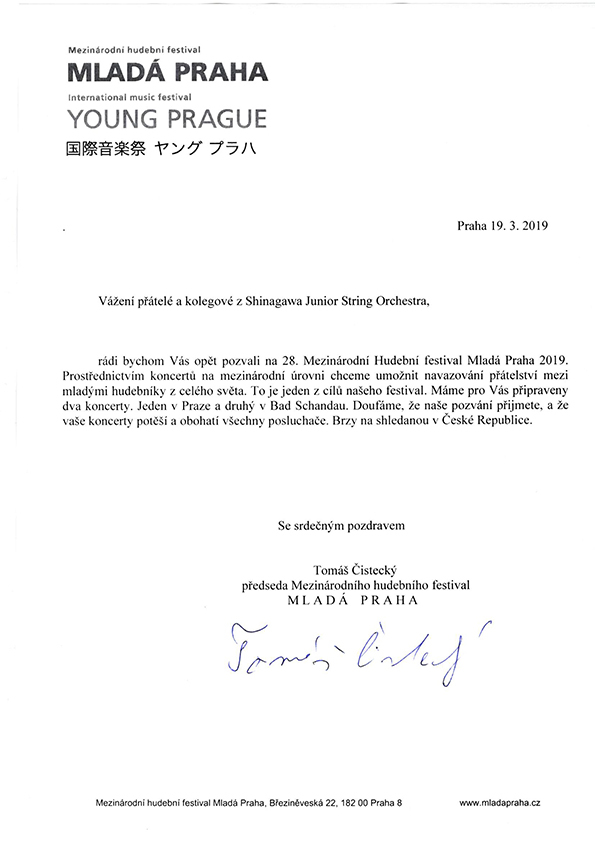 第28回国際音楽祭ヤングプラハからの招待状 本年は、8月25日(日)〜9月3日(火)まで10日間のドイツ・チェココンサートツアーを行ないます。コンサートは、ハイリッヒゲイシュトジュピタール・音楽ホール(ニュルンベルク)、ヨハネス教会(バードシャンダウ)、スメタナホール(プラハ)の3ヵ所で行なう予定です。第28回国際音楽祭ヤング プラハに参加、ニュルンベルク市からは恵まれない子どもたちへのチャリティコンサートを依頼されており、市庁舎訪問のお話もいただいています。