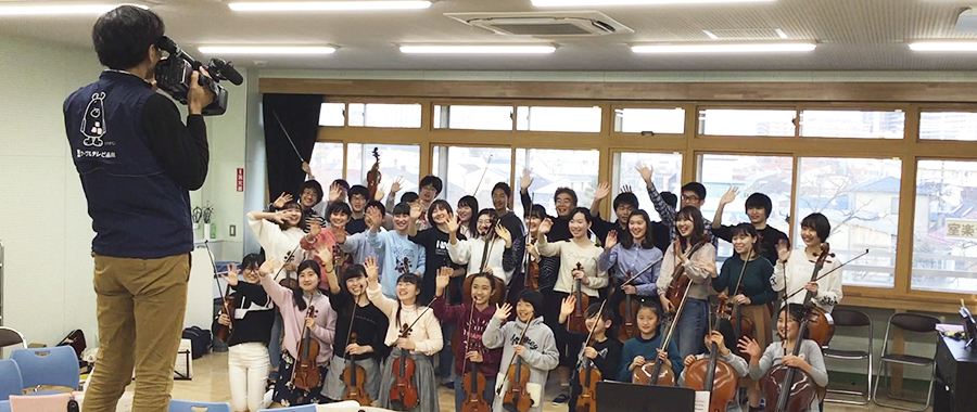 品川ケーブルテレビ取材時の様子 母体である品川弦楽団では、これまでに大学生メンバーがコンサートチラシを作成したり、パート練習をしたり、Twitterで発信したり、コンサートの告知方法を考えたりと運営にも力を発揮してくれています。トゥインクル音楽院サマースクールなどでも培われてきた人間関係、人としての成長の結果と頼もしく感じます。