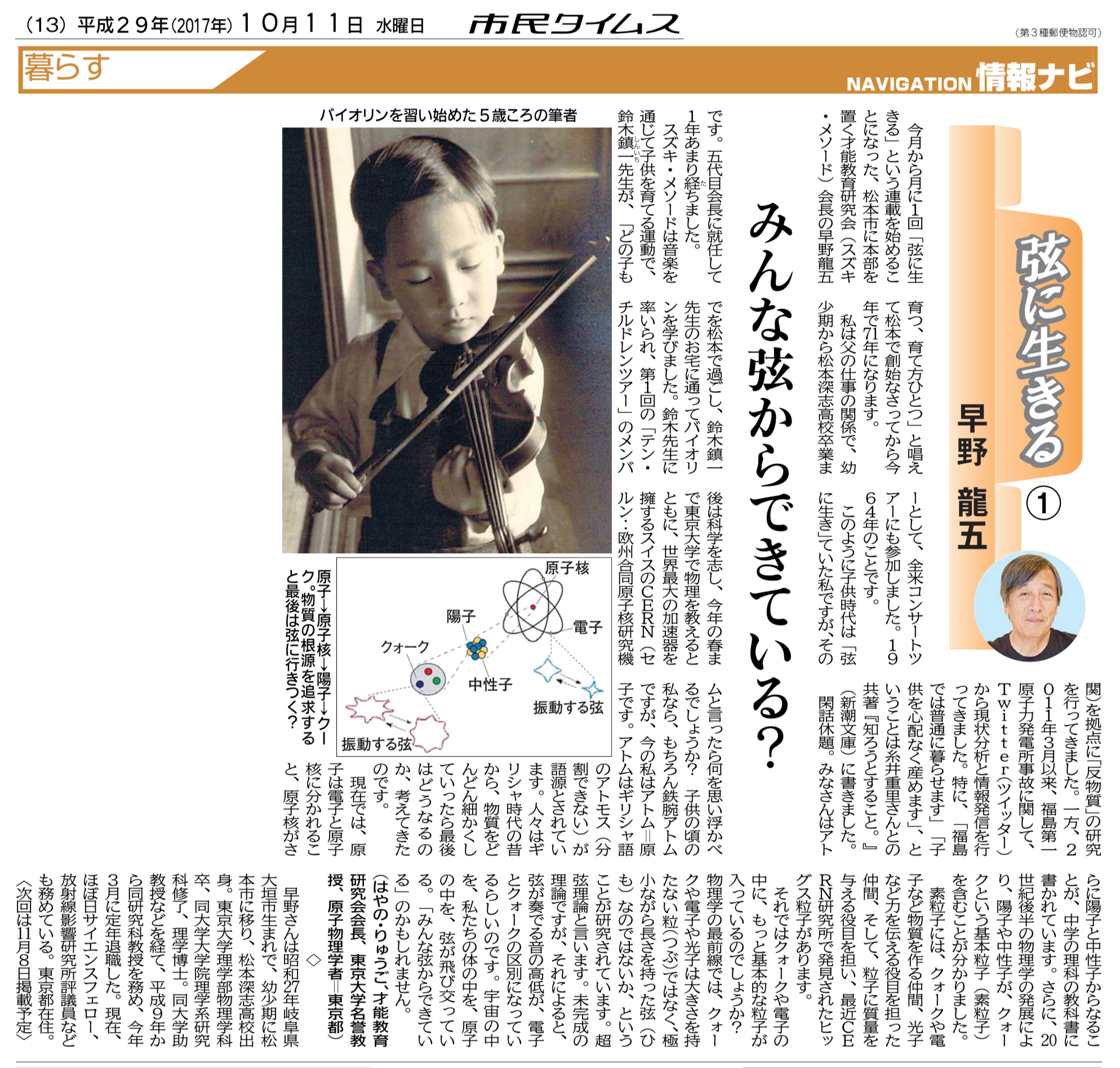 松本・安曇野・塩尻・木曽をカバーする地域新聞「市民タイムス」の「情報ナビ」のページに、早野龍五会長執筆による連載記事が、10月11日よりスタートしました。その名も「弦に生きる」。暮らしの中の科学をわかりやすく紹介するコラム記事で、毎月第2水曜日に掲載される予定です。初回から、ご専門の原子物理学の最前線に自然と入っていくところなど、これからの展開が楽しみです。