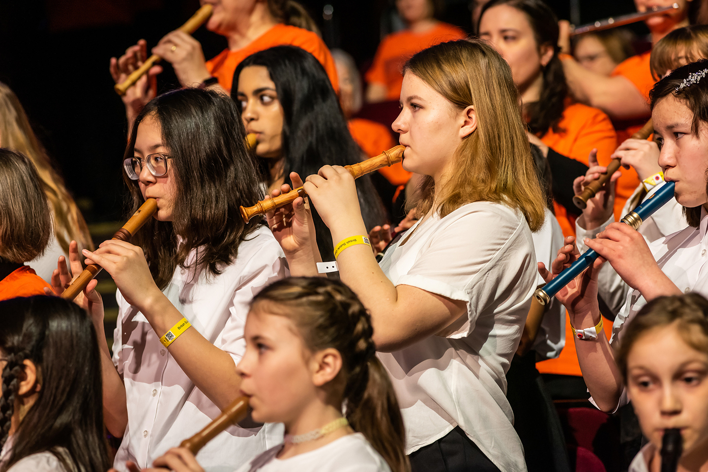 音楽監督としての私の役割は、どんなに地味な第1巻の民謡でも、その可能性を最大限に引き出すような編曲をすることで、世界の有名なコンサートホールで聴くのにもふさわしいと思われるようにすることでした。ピアノ伴奏者だけでなく、16人のプロのスズキの先生からなる弦楽合奏団を迎えたことで、プログラムのほとんどの曲が、演奏者にとって「協奏曲」のように感じられるようになりました。個々の楽器のための曲や、Twinkles、Wishing、Gavotte in G minorなどの曲に加え、1,300人の子どもたち全員が一緒に演奏できるように、Book1の曲のメドレーやイギリスの民謡「Greensleeves」のアレンジも作曲しました。