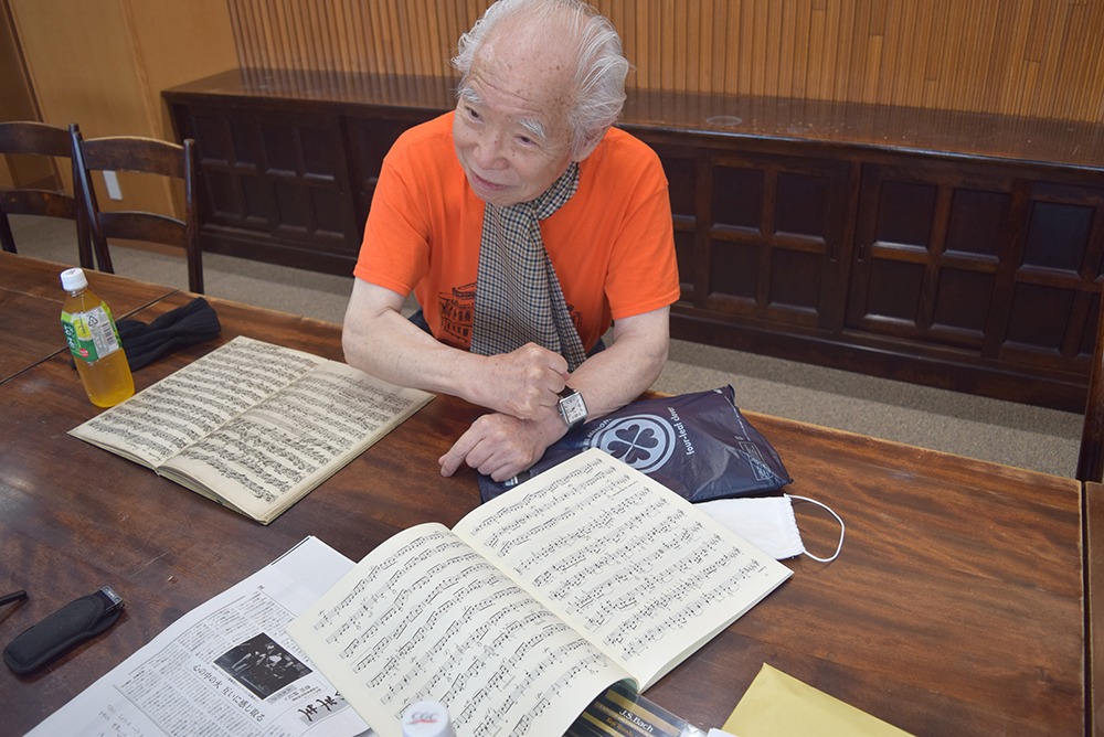 インタビューは、9月2日、松本の才能教育会館会議室で、十分に感染対策をした上で、行ないました。前日に87歳になられたばかりの豊田先生は、色鮮やかなオレンジのTシャツにマフラー!という組み合わせで登場されました。