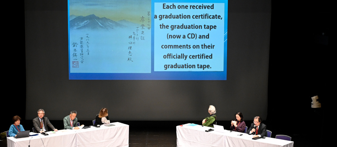 才能教育研究会(TERI)からは、鈴木先生が録音を聴いていらっしゃる映像や「鈴木鎮一マンガ物語」の英訳サンプル版で卒業制度の必要性を鈴木先生が思い描いた場面を使いながら、卒業制度が始まった頃の様子を発表しました。特に、生徒の卒業録音に記録された鈴木先生ご自身の声でのお返事が紹介され、「人間が人間の心を感じるお稽古をすることが、バッハやモーツァルトの心を感じる能力に育っていくことになるのです。これが、才能教育の中で、一番大事なことです」というメッセージは、スズキ・メソードが目指す「音楽を通しての人間教育」を表している言葉として、参加者みなの心に響きました。