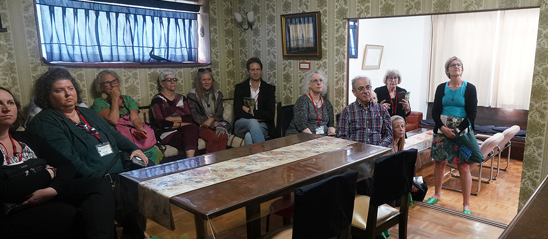 素晴らしい晴天に恵まれ、まるで鈴木先生が皆さんを温かく迎えてくださっているかのようでした。私の乗車した2号車の最初の目的地は、かつてのお住まいでもあった「鈴木鎮一記念館」です。たくさんの遺品や資料、DVDの鑑賞などもして皆さんそれぞれの思い出と重なり、感傷に浸っておられました。ちょうど一般のお客様も入って来られて海外に広がったスズキ・メソードの足跡を熱心に鑑賞されていました。そして実際にたくさんのティーチャー・トレーナーを目の当たりにして、海外に広がったスズキ・メソードを深く実感されたようです。なお、中島実行委員長が同行された1号車は、最初にお墓参り、その後鈴木鎮一記念館訪問という流れでした。