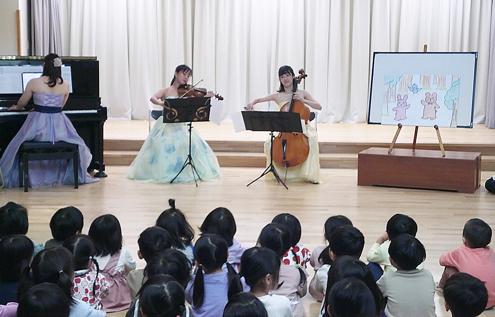 そして今年の1月より、息子のチェロの先生でもあるチェリストの塚尾さんとともに、ピアノトリオで「園への出張コンサート」を企画し、スタート。実際にやってみての感触は、ホールへ足を運ぶコンサートとはちがって、毎日生活している環境で音楽に触れてもらえるため、より自然体で楽しんでもらえているように感じます。