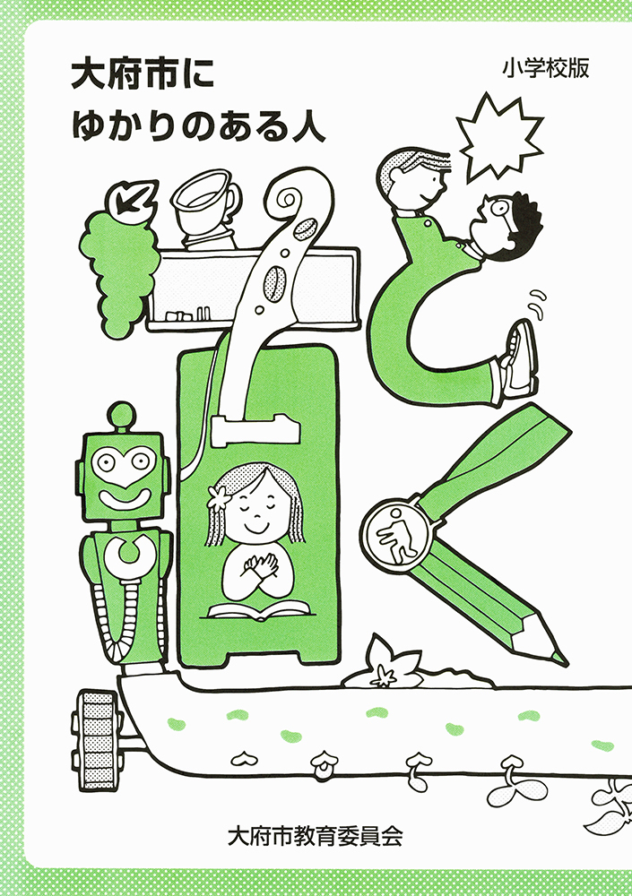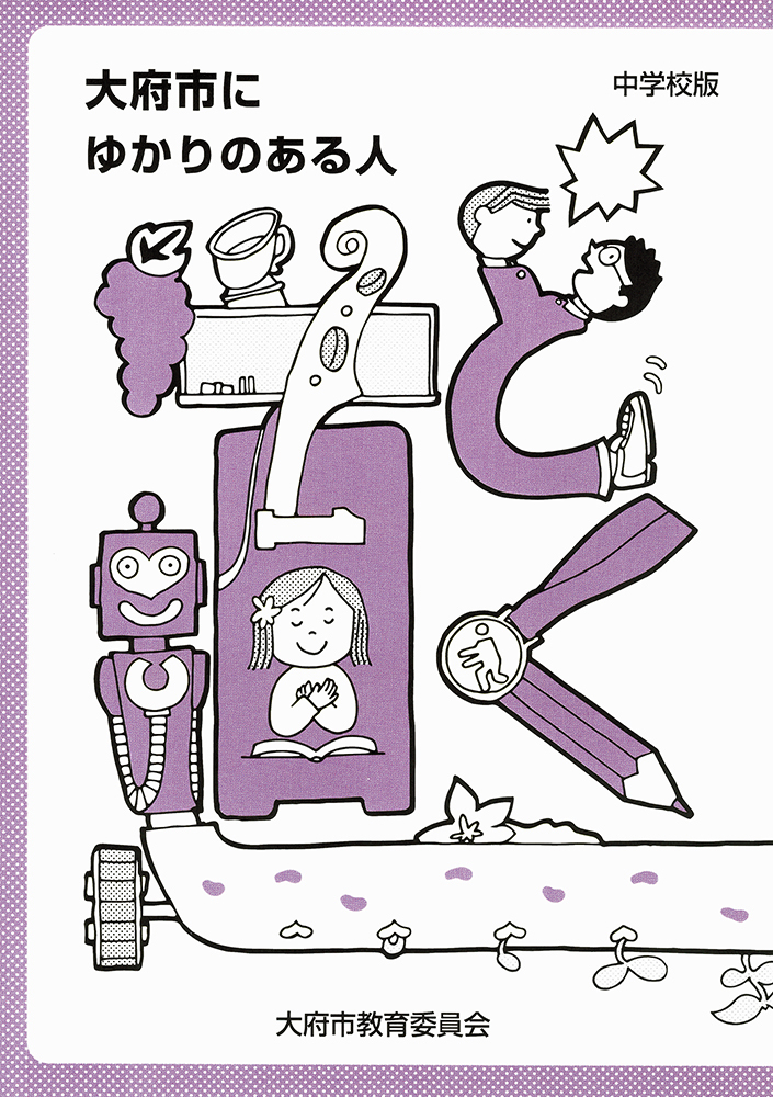 編集作業は、大府市の小中学校に勤める教員の皆さんによるプロジェクトチーム「大府市にゆかりのある人編集委員会」が担当されました。毎日の教務などで多忙を極める現役の先生方が知恵を絞られての内容。表紙を始め、中面のイラストも教員の作と聞き、さらに驚いた次第です。