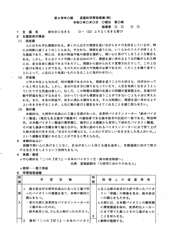 ここで紹介しました指導案例は、あくまでもサンプルです。その通りに授業が行なわれなくても構いません。道徳の授業は、授業者によって違う視点で捉えてもいい科目です。指導案は提案であり、展開は自由。正解はありません。今は、まとめない方向が道徳の授業スタイルです。投げかけ、討論し、考えを深めあう。友だちの考えを聞いて自分の考えを深めてゆくことが大切です。目標地点を設定して、そこに行かなければならないというのは、しません。「考えて討論する道徳」。ここが盛り上がるかどうかです。