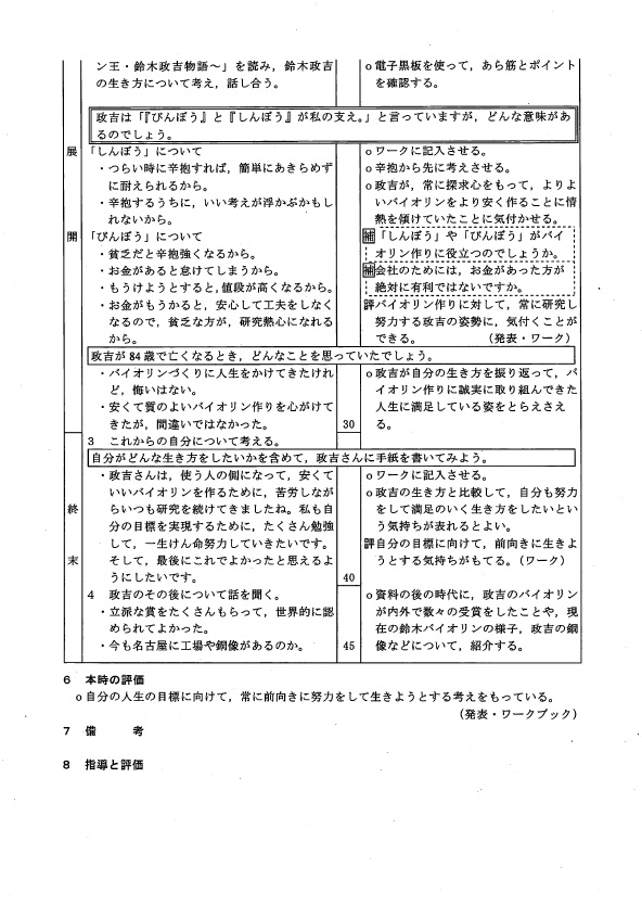 自分たちの作った教材に、命が吹き込まれたような気がして、このように展開できるんだなと思いました。ライブ感あふれる感じです。7人のゆかりの方すべてに年表を入れる、入れないというのも随分討議しました。政吉さんの場合は、ここに至るまでの流れがあったほうがいいと判断し、年表を入れました。東先生にそのことは話していませんでしたが、ああやって黒板に自作の年表を貼り、見せ続けることで、政吉さんのたどられた変遷がわかるからこそ、「しんぼう」と「びんぼう」が出てきたんだなとわかります。ですから、入れて良かったなと。上手に活用されていましたね。〇〇ぼうを答えさせるのは、指導案例では記載されていませんから、まったく東先生のオリジナルでしたが、上手な惹きつけになっていました。指導案例の「お金があった方が会社のためにはいいのではないか?」の補助発問も、子どもたちの関心を高めるための工夫として用意していましたが、上手く使っていました。流れに変化をつける目的ですね。途中でも「今、いいこと言ったね」などと発することで、人の意見を聞くことも子どもたちは学んでいました。一人の意見を別の子どもにもう一度言わせるのは、東先生のスタイルですが、意見を聞き合う習慣づけになっていて、すごくいい方法です。言葉が少し変わったりすると、さらに意見が深め合うことにもなりますから。板書の整理も、いつもながら見事でした。
