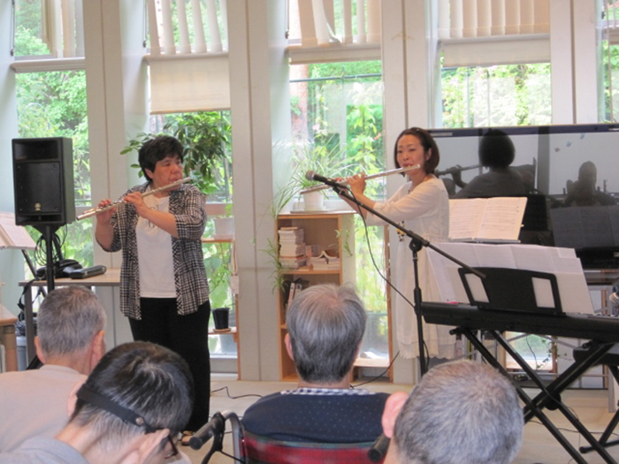植田先生にお願いして、2015年8月末に私の職場にもいらしていただき、演奏をお願いしたことがありました。その時に、一緒にフルート二重奏をさせていただきました。曲は、グルックの「精霊の踊り」と「いい日旅立ち」の2曲。入所者の皆さんにとても喜んでいただき、嬉しかったですね。