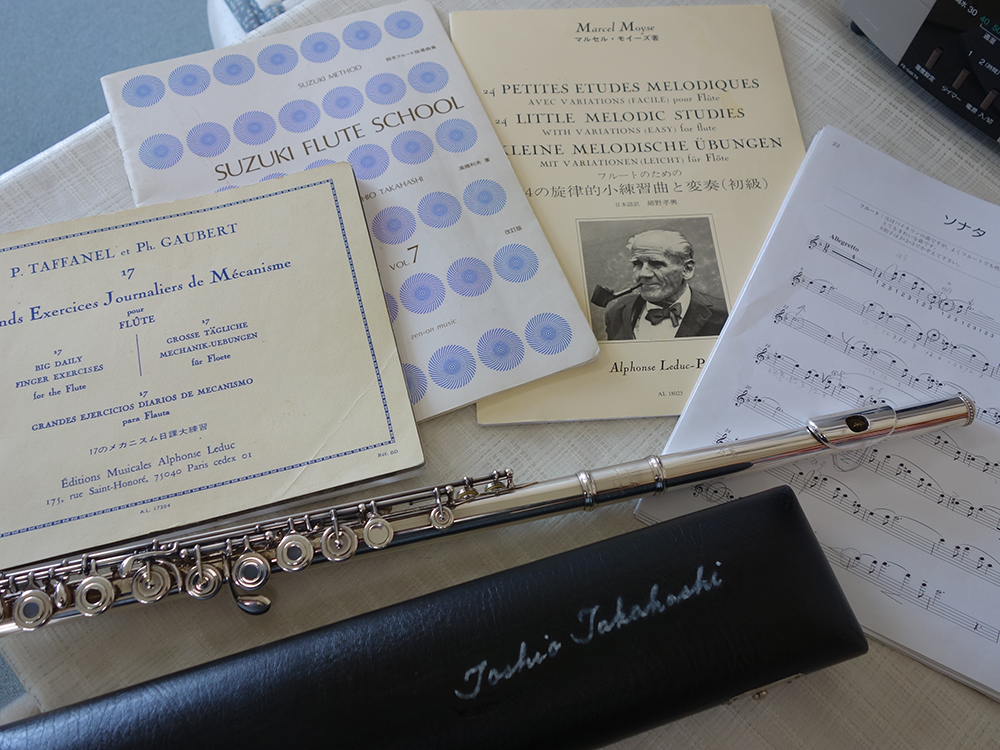 中学時代にブラスバンドでフルートと出会ったものの、その後は長いブランクがあったという齊藤さん。一念発起してフルートを再開したのは、10年ほど前のこと。テキストに使っているフルート科指導曲集を編纂された髙橋利夫先生が、スズキのフルート科を創設されたことに、とても興味があったと言います。「ある時、植田先生から『髙橋先生に会いに行こうよ』の一言で、心が揺らいだんですね。どんな方なのかなと思っていましたから」。今では、齊藤さんのフルートケースには、髙橋先生のサインが輝いていますし、また、その後のグループレッスンや夏期学校などの講習会で会われるたびに、ワクワクされるといいます。世界中に髙橋先生を慕うフルーティストがいますが、齊藤さんもその中のお一人というわけです。2014年にスズキ・メソード甲府支部で髙橋先生をお招きしたグループレッスンの場で、「松本の方だと思っていましたよ」と髙橋先生から勘違いされたほど、髙橋先生のおられる松本市にもよく通った齊藤さん。その熱心さには、頭が下がります。