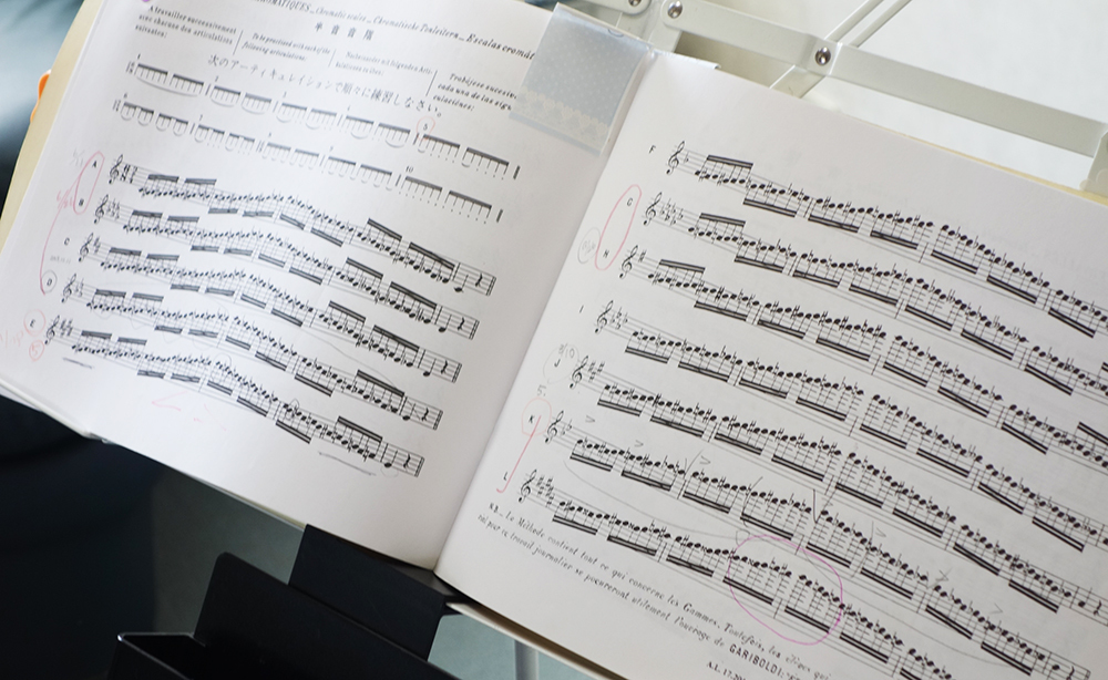 そのあと、音階教本の「タファネル=ゴーベール」を使って、半音階の練習が続きました。臨時記号だらけの楽譜に目がクラクラしそうです。齊藤さんは、「植田先生から、いきなりここをやりましょう、と毎回言われるのですが、決して大変ではありません。このあたりだろうなと思って予想しても、毎回はずれます(笑)。でも、昔は本当に大変でした。今では慣れましたし、大丈夫ですね」。さすがです。齊藤さんは、いきなり指摘された半音階のスケールでも動じることなく、堂々と吹いていました。自然に読譜力も付いてきているのですから、たいしたものです。