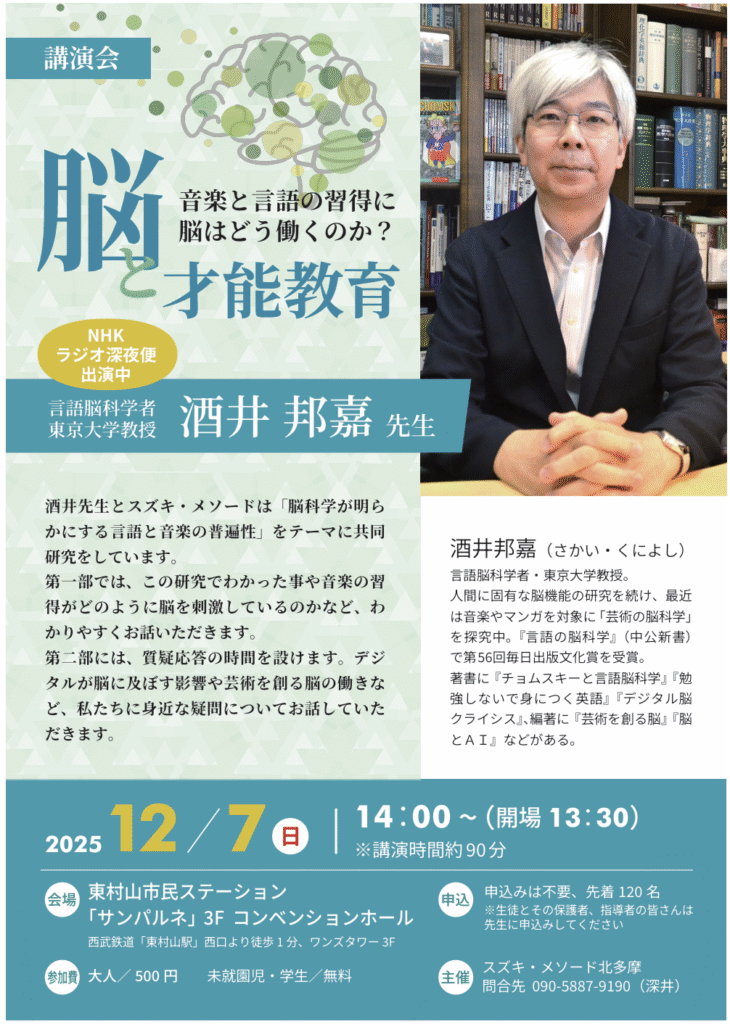 2025.12.2 イベント情報 酒井邦嘉先生の講演会 「北多摩会では酒井邦嘉先生の講演会を企画しています。スズキ・メソードとの共同研究のお話を中心に、音楽の習得がどのように脳を刺激しているのか?など、私たちに身近なテーマでお話いただきます。」