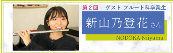 第2回目のゲストはフルート科卒業生の新山乃登花(にいやまのどか)さん、大学を卒業して2年目の若きフルーティストです。子どもの頃から熱心にフルートに取り組み、スズキ・テンチルドレン(選抜された子どもたち10人による演奏ツアー)のメンバーとして日本各地での演奏会に出演するなど、充実した音楽経験を積みながら勉強も両立し、現在は薬剤師として活躍しています。