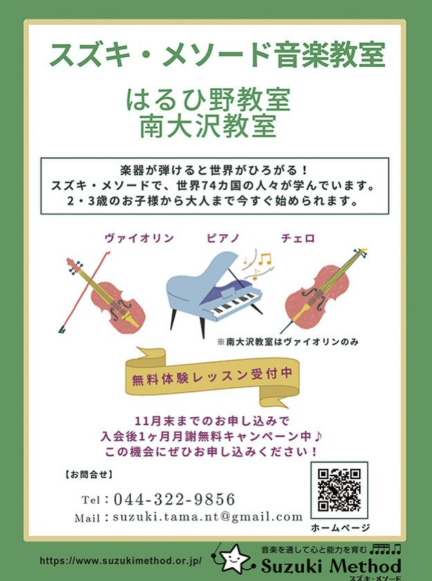 スズキ・メソードはるひ野教室、南大沢教室では秋のお得なキャンペーンを実施しています。
