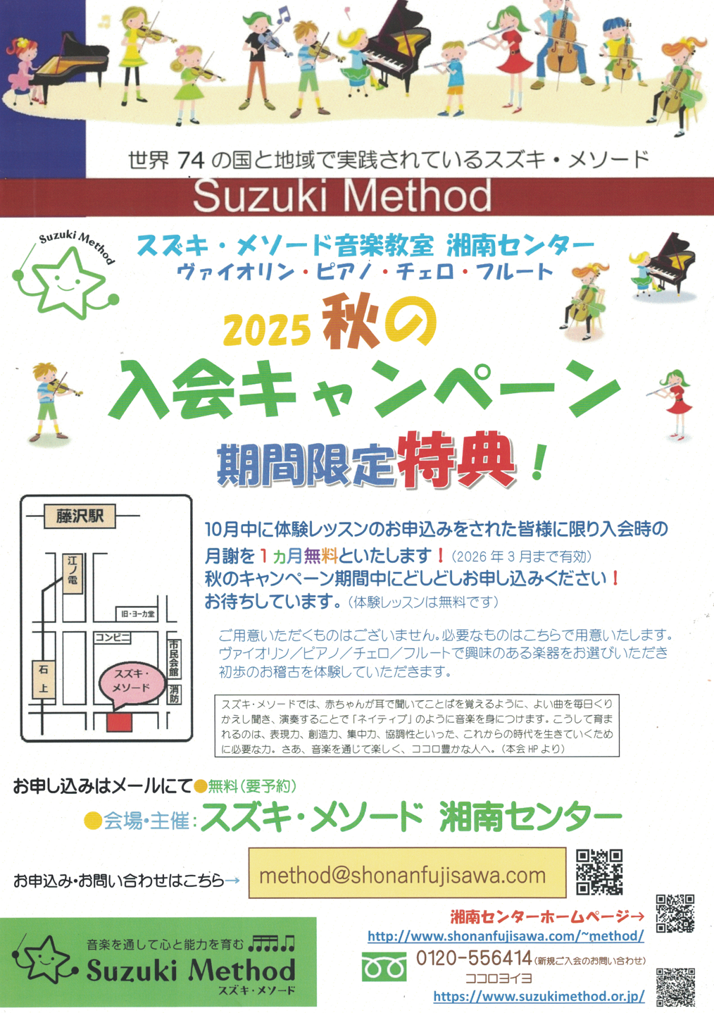 2025.10.10 体験会・説明会 スズキ・メソード湘南センター/「秋の入会キャンペーン」のお知らせ スズキ・メソード湘南センター/「秋の入会キャンペーン」のお知らせ ★10月中に体験レッスンのお申し込みをされると特典がございます。どしどしお申し込みください!